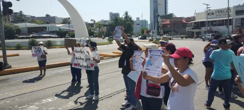 ACAPULCO, Gro., 23 de marzo de 2026.- Familiares y compañeras de la maestra Maricela Minerva Pineda Mendoza, reportada como desaparecida, protestan en la avenida Costera Miguel Alemán de este puerto, frente a la Diana Cazadora, para exigir su localización.