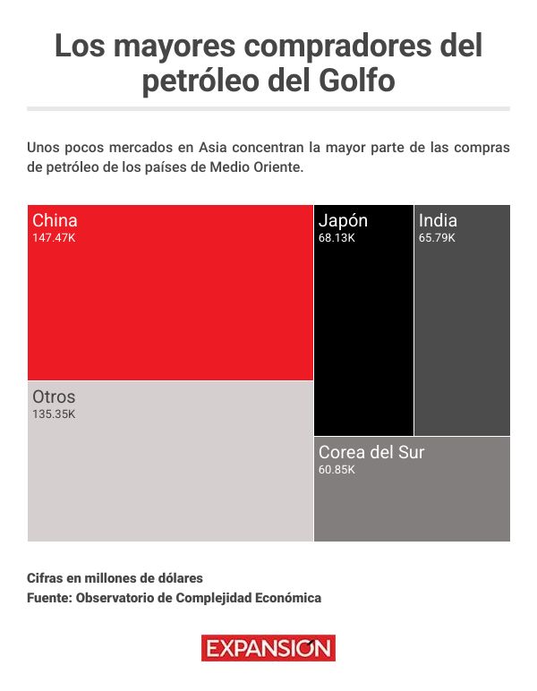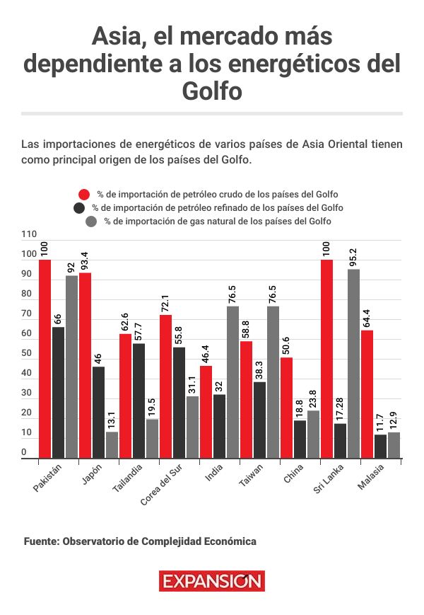 ¿Cuáles son los países más afectados por la crisis energética? En 2024, casi 21 millones de barriles de petróleo al día cruzaron el Estrecho de Ormuz, el estrecho pasaje que conecta el Golfo Pérsico con el mundo. Más de 80% de este suministro va a Asia, de acuerdo con la Administración de Información de Energía estadounidense. China ha sido durante mucho tiempo el mayor comprador de petróleo y gas de las naciones del Golfo Persa. Y con más de un tercio de su suministro total procedente de la región, la interrupción es significativa para Beijing. Pero otros países dependen casi por completo de la región para sus necesidades energéticas. La economía de India , otro de los principales compradores de los combustibles del Golfo, depende de Oriente Medio para aproximadamente el 40% de las importaciones de petróleo del país y el 80% de su gas, una escasez de gas para cocinar está apretando a los hogares. Pakistán también sufre de una gran dependencia de los hidrocarburos de esta región, pues el 100% de sus importaciones de petróleo y un 92% de las de gas natural provienen de estos países. Sri Lanka, por su parte, también trae del Golfo más del 95% del gas que importa. La Agencia Internacional de Energía indica que alrededor de 2,300 millones de personas en Asia utilizan gas natural para cocinar, y la interrupción de las cadenas de suministro pone en riesgo su seguridad alimentaria y salud. Qatar , que es el principal proveedor de gas natural para esta región, anunció la semana pasada la reducción de 17% de su capacidad exportadora por los ataques iraníes contra Ras Laffan, el principal puerto de exportación de este producto. La falta de capacidad de almacenamiento de gas deja a la mayoría de los países asiáticos vulnerables a los aumentos de precio , según el Institute for Energy Economics and Financial Analysis.