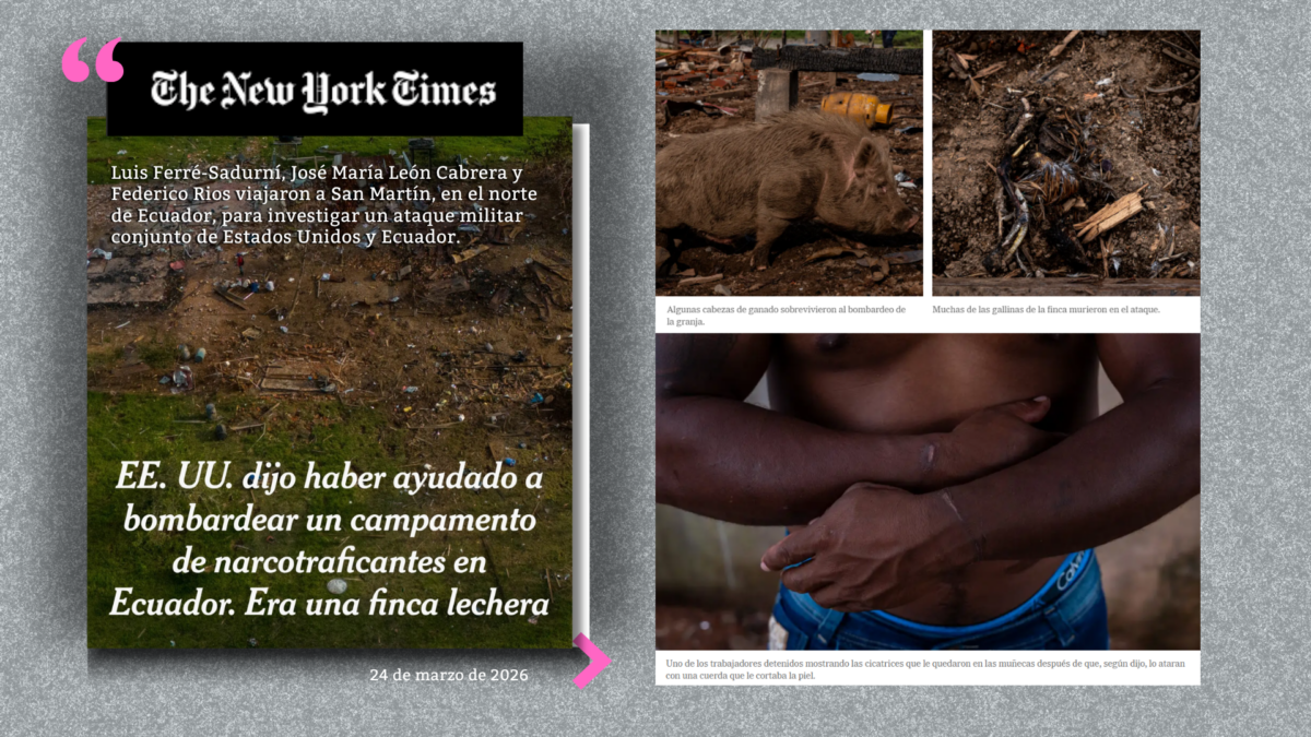 ECUADOR. – Una investigación de The New York Times publicada el 24 de marzo de 2026 revela que el bombardeo conjunto entre Ecuador y Estados Unidos del 6 de marzo en San Martín, Sucumbíos, no destruyó un supuesto campamento de entrenamiento de los Comandos de la Frontera, como afirman fuentes gubernamentales, sino una finca ganadera y lechera en plena operación. Testimonios de propietarios, trabajadores y vecinos desmienten la versión oficial. Los medios locales refuerzan las denuncias de incursiones previas de las fuerzas y daños —incluso tortura a civiles—. ¿Qué está en juego si se cuestiona la narrativa oficial de la lucha contra el narcoterrorismo?