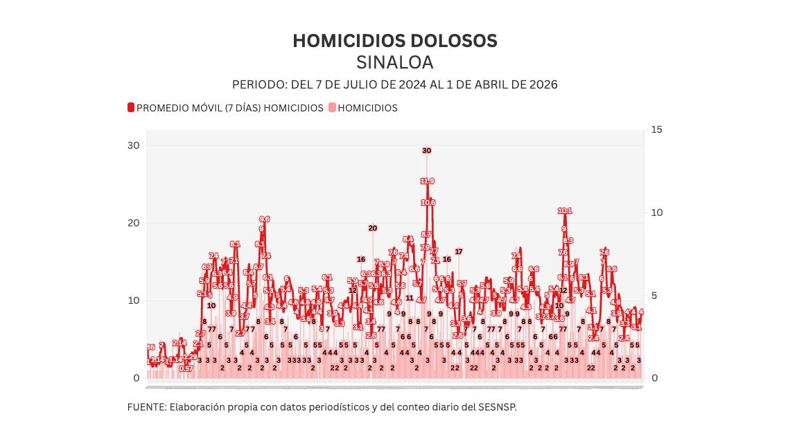 Noroeste calcula un promedio móvil diario de 7 días para medir con mayor sensibilidad la evolución del homicidio en Sinaloa. Al día de hoy, el promedio ascendió a 4.0 asesinatos diarios.