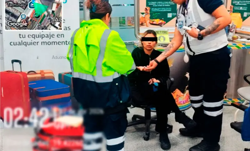 Los hechos ocurrieron en la Terminal 2 del AICM, cuando personal naval brindó apoyo durante la inspección de equipaje de la pasajera procedente de Bogotá, Colombia, en un vuelo comercial.