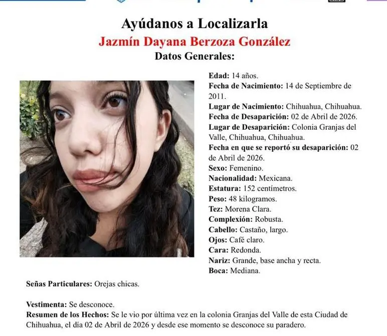 CHIHUAHUA, Chih., 2 de abril de 2026.– Autoridades estatales activaron una pesquisa para localizar a la adolescente Jazmín Dayana Berzoza González, de 14 años de edad, quien fue reportada como desaparecida en la ciudad de Chihuahua.