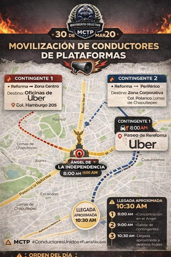 Conductores de plataformas digitales realizarán una movilización este lunes en la Ciudad de México, con concentración a las 8:00 horas en el Ángel de la Independencia, para marchar hacia distintos puntos estratégicos, incluyendo oficinas de Uber y zonas corporativas en Polanco.