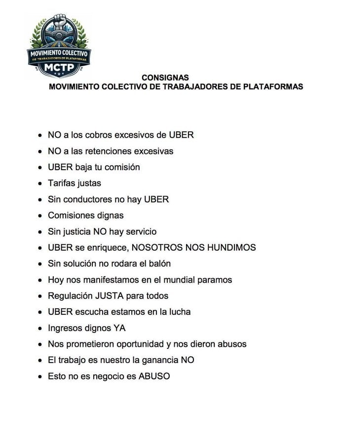 La protesta es convocada por el Movimiento Colectivo de Trabajadores de Plataformas (MCTP), que acusa abusos en comisiones, cobros y condiciones laborales dentro del modelo de negocio de aplicaciones como Uber.