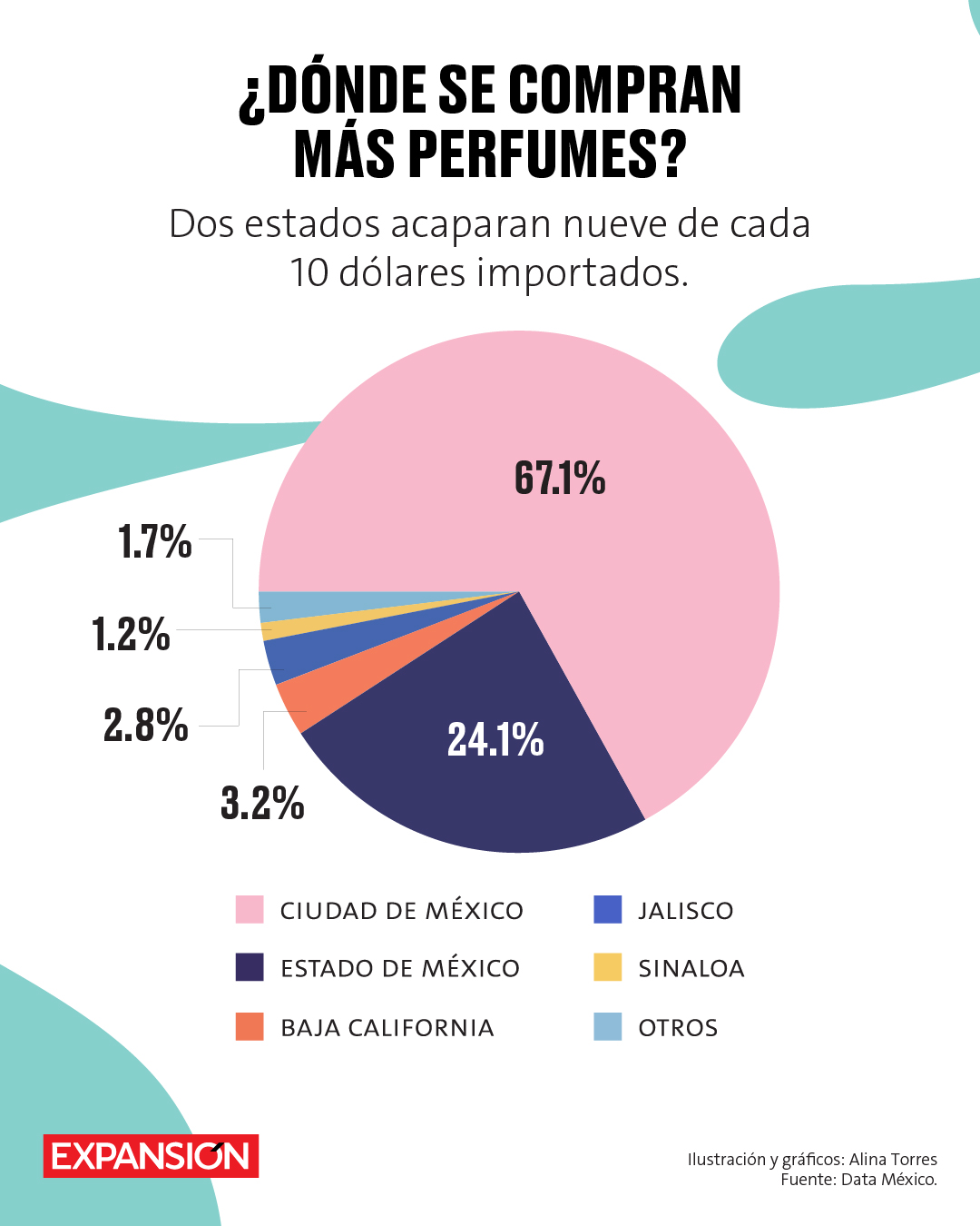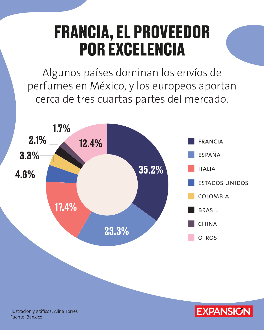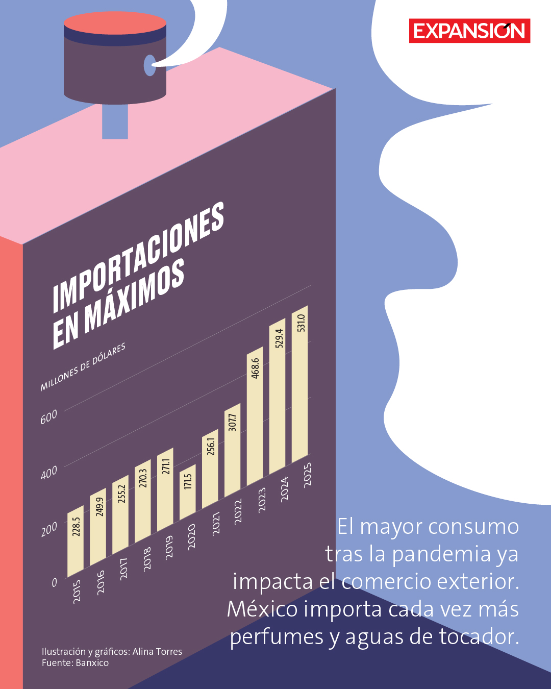Rodríguez, de 42 años, empezó con una fragancia para levantar el ánimo , luego otra para sentirse distinta y una más para marcar los días. Hoy, su colección se acerca a las 100 botellas. Cada aroma representa un estado de ánimo, una rutina o una etapa. Hay uno para trabajar desde casa, otro para una videollamada y otro más para salir. Este no es un caso aislado. Como ella, muchos mexicanos modificaron sus hábitos de consumo y encontraron en las fragancias un gusto constante . Lo que empezó como una distracción en medio del encierro se transformó en un hábito que sobrevivió al regreso de la movilidad y a la reapertura de la economía . Ese cambio íntimo, casi invisible, también dejó huella en el comercio exterior . Tras el covid-19, las importaciones de perfumes y lociones en México crecieron con fuerza y reflejan un consumo que no volvió a su punto de partida. De acuerdo con datos del Banco de México, las compras externas de perfumes se recuperaron en 2021 hasta niveles prepandemia, con un valor de 256 millones de dólares. A partir de ese año, el mercado no solo se estabilizó, también marcó récords. En 2024, las importaciones alcanzaron 529 millones de dólares y, para el cierre de 2025 , las cifras superan ligeramente ese récord, con 531 millones. La Ciudad de México y el Estado de México concentran alrededor del 90% de estas importaciones , lo que confirma su peso como centros de consumo, distribución y logística. Francia , considerada la cuna histórica de la perfumería, se mantiene como el principal proveedor , con una participación del 35.2%. Le siguen otros dos países europeos: España e Italia . Estados Unidos, primer socio comercial de México, ocupa el cuarto lugar. El auge de las importaciones acompaña un mercado interno en expansión. Se estima que la perfumería en México movió cerca de 915 millones de dólares en 2025 . Las proyecciones apuntan a un crecimiento sostenido durante la próxima década, con una expansión promedio anual del 6.6%. De mantenerse esa tendencia, el valor de la industria casi se duplicará y alcanzará alrededor de 1,734 mdd en 2035 , de acuerdo con la consultora Expert Market Research.
