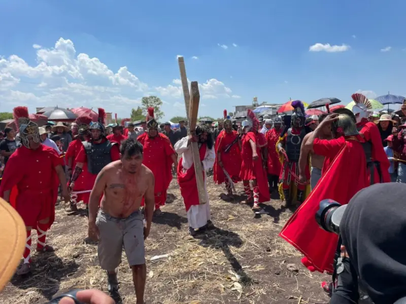 ¡Casi no llega a la Cruz!... ‘Jesús’ sufre fuerte caída por empujón durante Viacrucis en Edomex (Video)