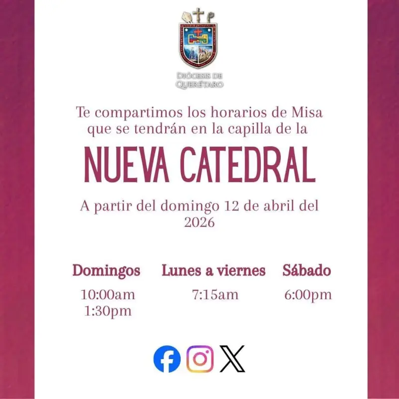 La Diócesis de Querétaro anunció que a partir del domingo 12 de abril de 2026 comenzarán las celebraciones litúrgicas en la capilla de la Nueva Catedral, marcando el inicio de actividades religiosas regulares en este recinto.