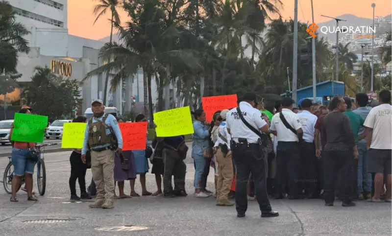 ACAPULCO, Gro., 3 de abril de 2026.- Vendedores ambulantes de la avenida Costera Miguel Alemán bloquearon una hora un tramo de esa principal vía de Acapulco, tras su desalojo de las banquetas.