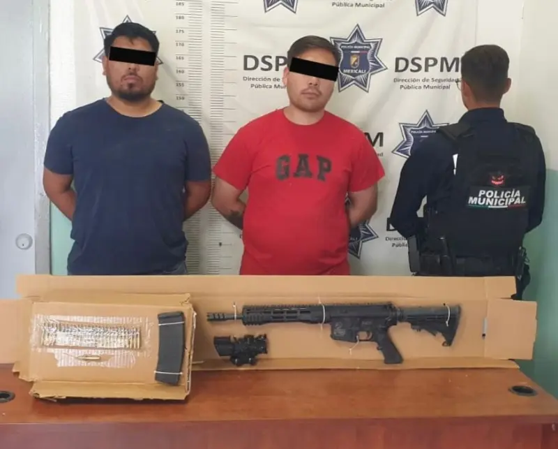 Un reporte de detonaciones de arma de fuego en el fraccionamiento Zafiro de Mexicali derivó este viernes en la detención de dos hombres y el aseguramiento de un rifle calibre 5.56 mm con mira telescópica y 27 cartuchos útiles, oculto dentro de un vehículo.