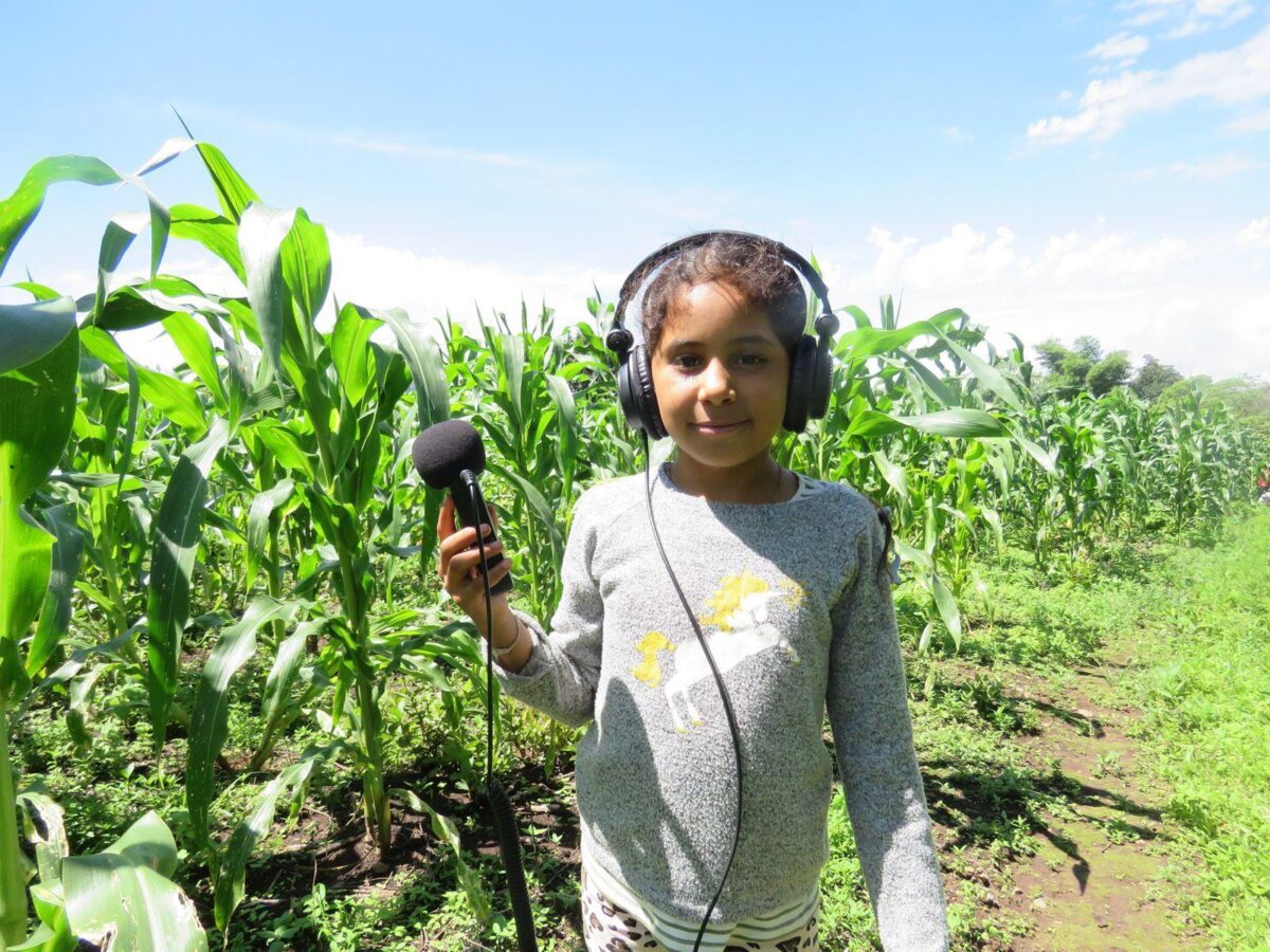 En Chirimoyos, Concordia, una niña graba sonidos del ambiente durante la práctica del taller de la brigada comunitaria.Foto: cortesía de Dano García.
