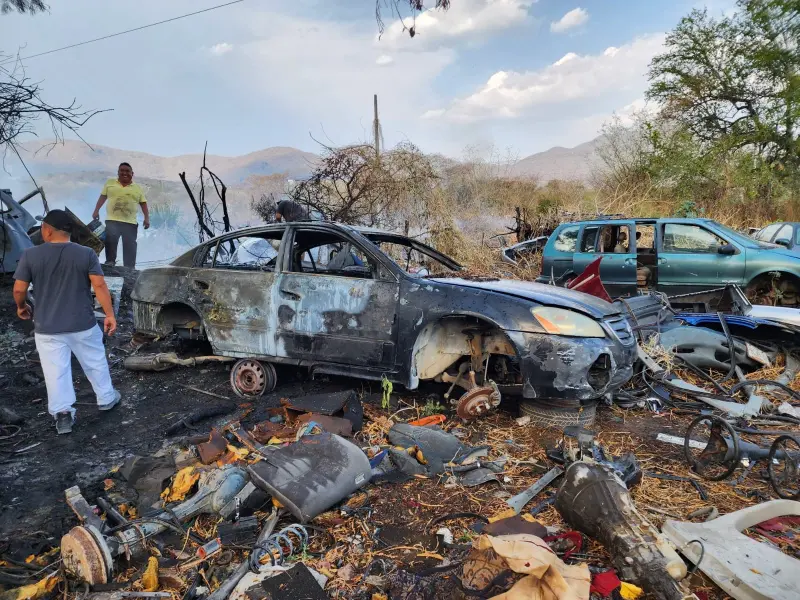 CHILPANCINGO, Gro., 5 de abril del 2026.- Un deshuesadero con autos en su interior, se incendió en la carretera Iguala-Taxco.