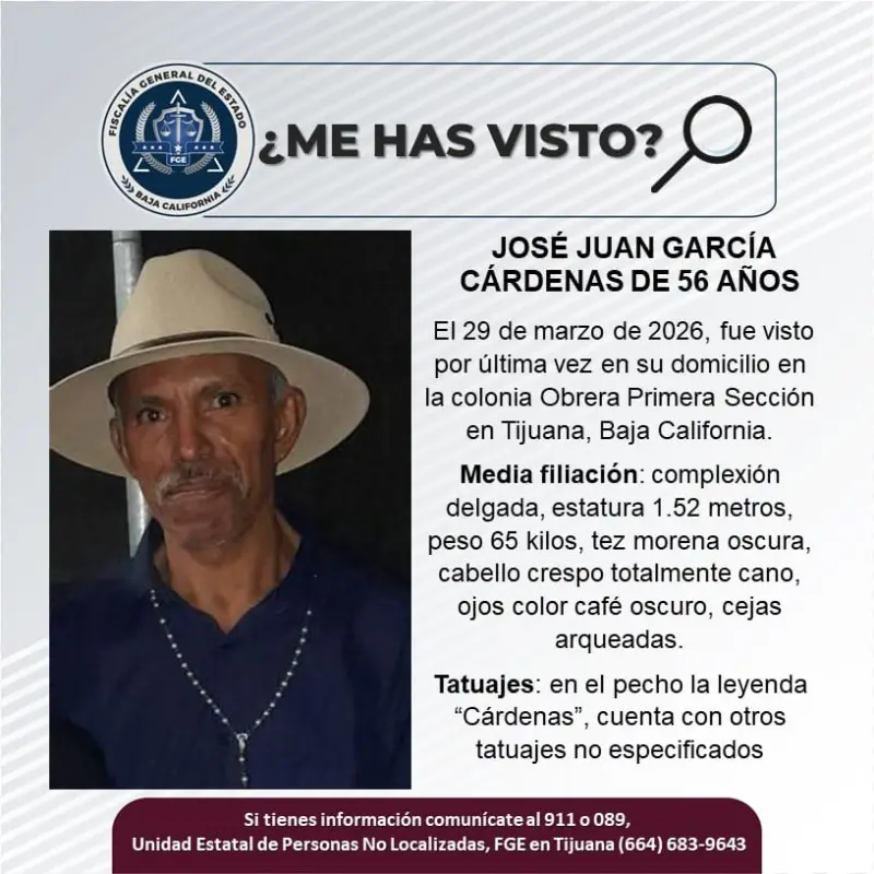 Fue visto por última vez el 29 de marzo de 2026.Por lo anterior, se solicita la colaboración de la ciudadanía, para que, en caso de tener información o datos sobre su posible paradero, se reporte al teléfono en Tijuana (664) 683-9643, o bien al número de emergencias 911 o al de denuncia anónima 089.