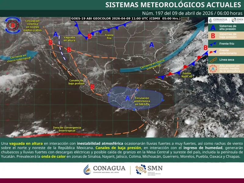 MÉRIDA, Yuc., 9 de abril de 2026.- Este jueves, canales de baja presión en la Mesa Central, sureste del país y la península de Yucatán, en interacción con el ingreso de humedad del océano Pacífico, golfo de México y mar Caribe, generarán chubascos y lluvias fuertes con descargas eléctricas y posible caída de granizo en dichas regiones, esto según reporta el Servicio Meteorológico Nacional (SMN) de la Conagua.