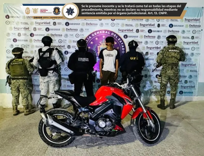 Un boletín refirió que en el municipio de Acapulco, durante dispositivos en las colonias Pie de la Cuesta y Ciudad Renacimiento, se logró la detención de dos hombres, así como el aseguramiento de dos motocicletas con reporte de robo.