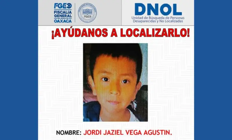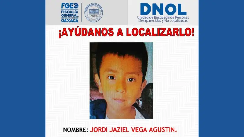 OAXACA, Oax. 12 de abril de 2026.- La Fiscalía General del Estado de Oaxaca difundió la ficha de búsqueda de un niño de 5 años de edad, identificado como Jordi Jaziel Vega Agustín, quien desapareció en la región de la Cuenca del Papaloapan.