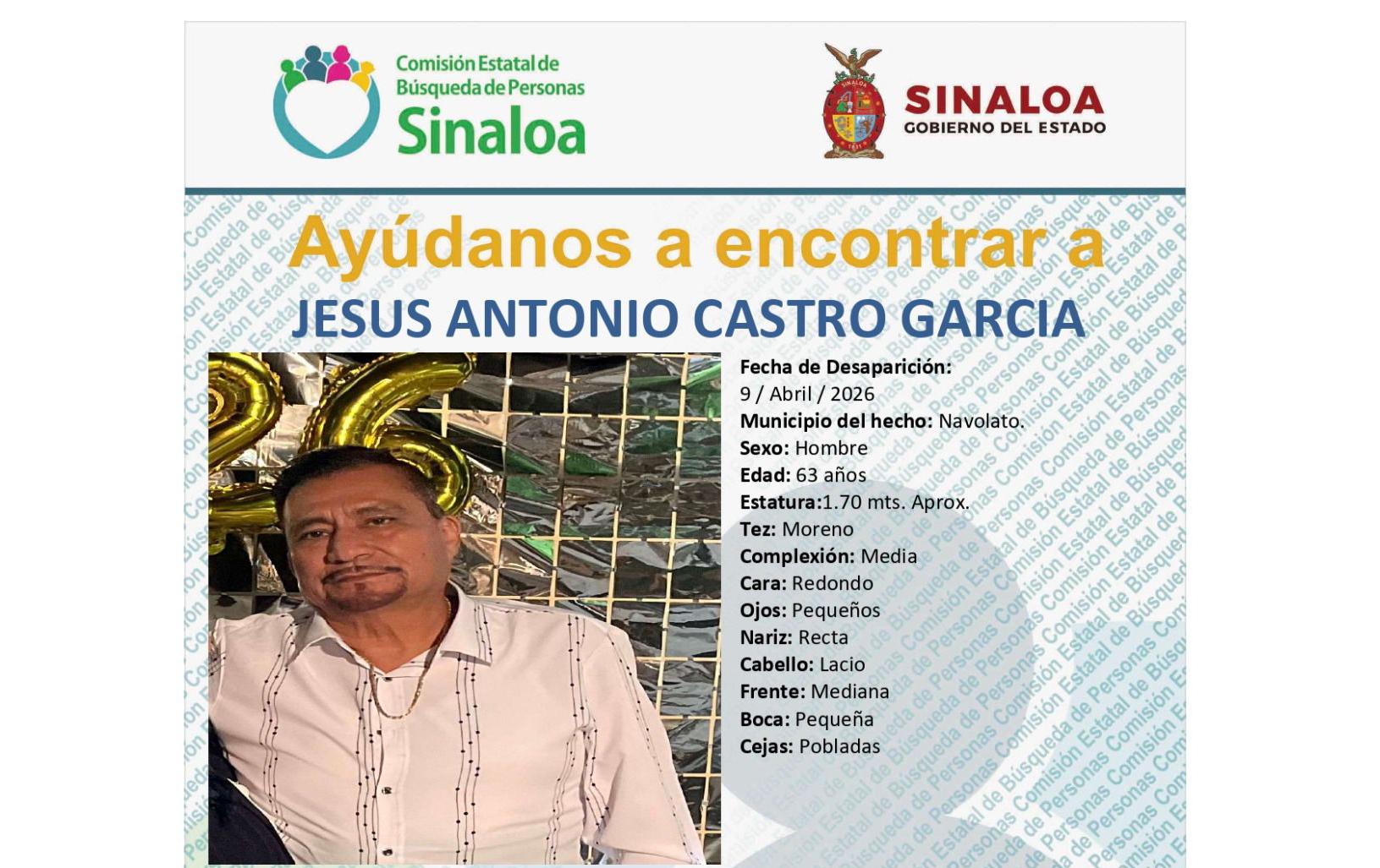 La familia de Jesús Antonio Castro García denunció la desaparición del enfermero jubilado de 60 años, tras haber sido detenido por elementos de la Policía Municipal de Navolato el pasado jueves 9 de abril.