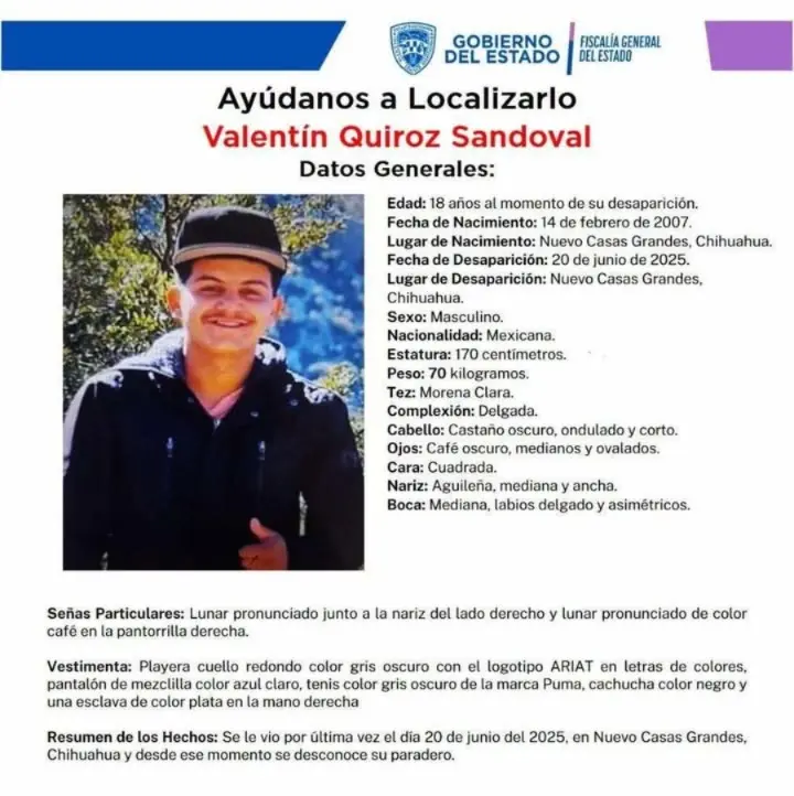 CHIHUAHUA, Chih., 12 de abril de 2026.- La familia del joven Valentín Quiroz Sandoval de 18 años, quien desapareció el 20 de junio del año pasado en Nuevo Casas Grandes, solicitó ayuda a la comunidad para su localización.