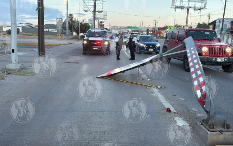Elementos de la Coordinación General de Seguridad Vial acudieron hasta la calle Waterfill a pocos metros de las garitas de peaje del cruce fronterizo, para tomar conocimiento de los daños que causó el camión, cuyo conductor escapó antes de que llegaran las autoridades, para evadir el pago.