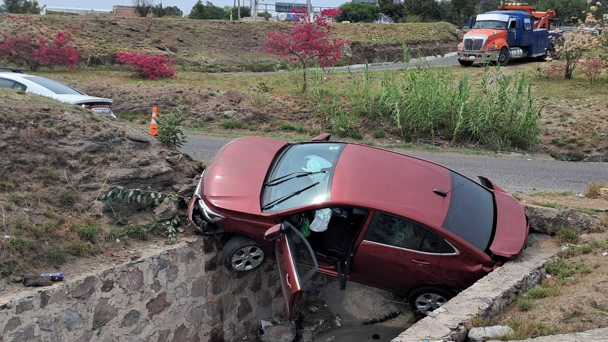 San Juan del Río, 17 de abril de 2026. —Un conductor perdió el control de su vehículo Chevrolet y cayó a un drenaje pluvial en el distribuidor que conecta Paseo Central con la autopista México-Querétaro, en San Juan del Río. El incidente no dejó personas con lesiones de gravedad, aunque los servicios de emergencia acudieron al lugar para valorar al operador del automóvil.