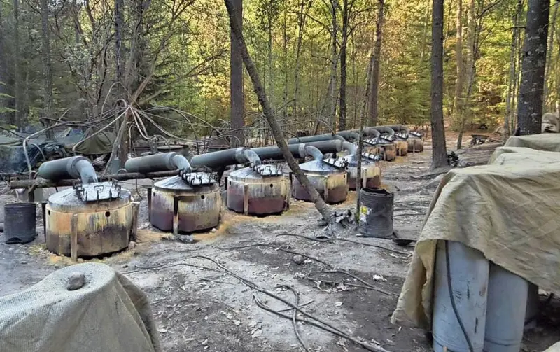 También ahí, señalan los datos oficiales, los agentes localizaron siete depósitos conectados a hornos por medio de mangueras, así como 10 depósitos de menor tamaño y 103 cilindros de gas, 61 de ellos conectados, entre otros elementos.