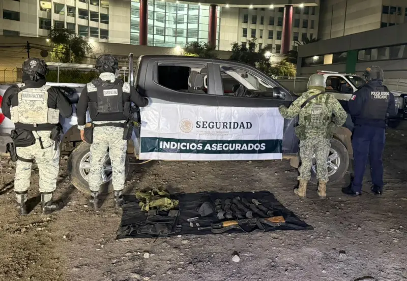 Además del armamento, los uniformados aseguraron dos chalecos tácticos balísticos, uno de ellos con una placa que contenía una leyenda relacionada con un grupo delictivo.