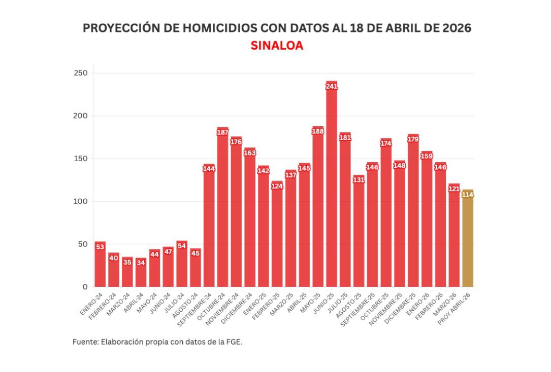 También Noroeste lleva un conteo mensual de acuerdo a lo registrado por el Secretariado Ejecutivo del Sistema Nacional de Seguridad Pública (SESNSP), en abril se han registrado 71 homicidios para un promedio de 3.9 diarios.