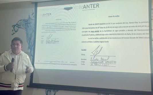 PIEDRAS NEGRAS, COAH.- El gerente general del SIMAS, Lorenzo Menera Sierra, aseguró en conferencia de prensa que interpondrá una denuncia penal contra el alcalde de Piedras Negras y el exsubgerente operativo del organismo, Ricardo Aguirre, por el presunto robo de mil tubos donados por la desarrolladora de viviendas Grupo MANTER S.A. de C.V.