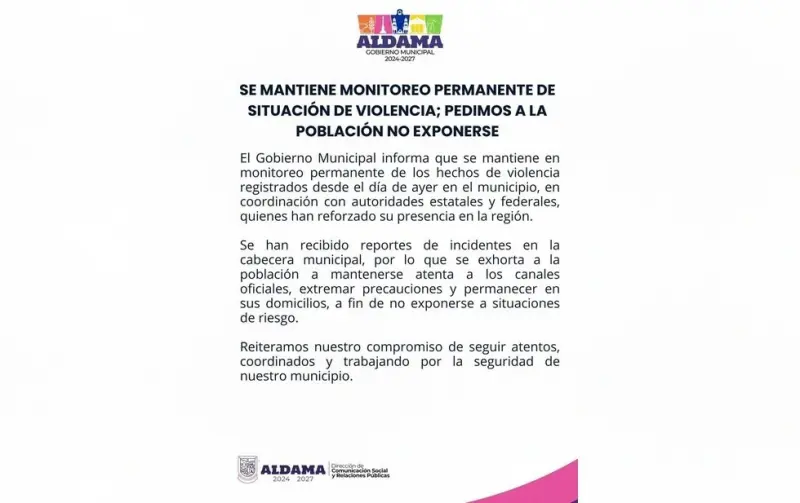 “Se han recibido reportes de incidentes en la cabecera municipal, por lo que se exhorta a la población a mantenerse atenta a los canales oficiales, extremar precauciones y permanecer en sus domicilios, a fin de no exponerse a situaciones de riesgo”, indican en el comunicado.
