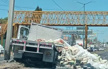 MORELIA, Mich., 21 de marzo de 2026. - El conductor de un vehículo cargado de cemento se estampó contra un muro luego de subirse al camellón, en la carretera Morelia-Salamanca; no se reportan lesionados.