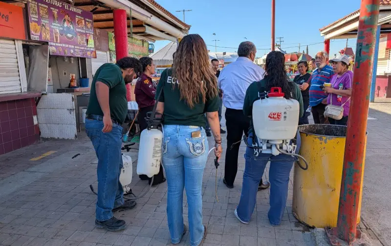Locatarios del Parque Borunda solicitaron el apoyo a las Direcciones de Regulación Comercial y Ecología del municipio, para realizar la fumigación de los espacios utilizados para la venta de alimentos, acción que se llevó a cabo esta mañana.