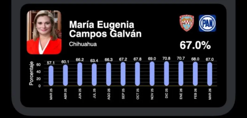 CHIHUAHUA, Chih., 30 de marzo de 2026.- La gobernadora Maru Campos registró en marzo una aprobación ciudadana del 67 por ciento, de acuerdo con el reporte “Gabinete, Gobernadores y Alcaldes”, ubicándose entre las mandatarias mejor evaluadas del país, aunque ligeramente por debajo del gobernador de Querétaro, Mauricio Kuri.