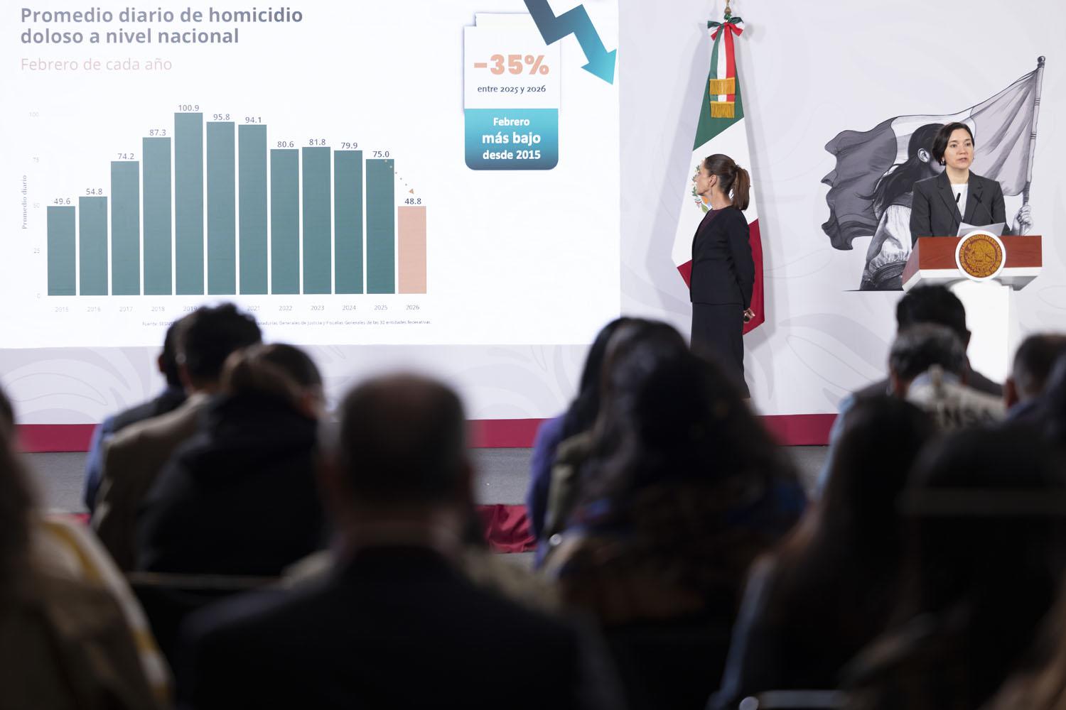 El promedio diario de homicidios dolosos en el país registró una disminución del 44 por ciento de septiembre de 2024 a febrero de 2026, lo que equivale a 38 casos menos al día, según informó la titular del Secretariado Ejecutivo del Sistema Nacional de Seguridad Pública, Marcela Figueroa.