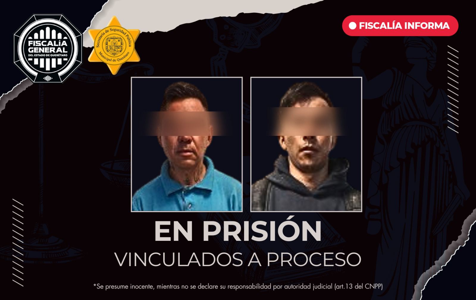 La Fiscalía General del Estado de Querétaro logró la vinculación a proceso de dos hombres por su probable autoría en el delito de robo, cometido en la capital del estado.