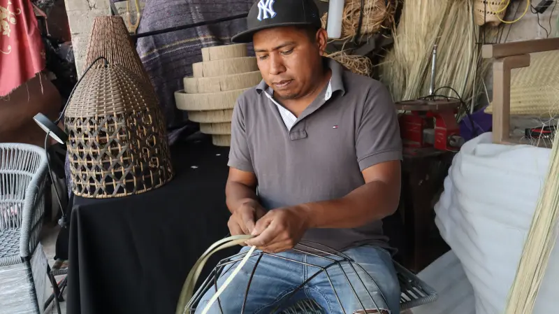 Valente Nazario es la segunda generación de artesanos en su familia y espera que sus hijos continúen con este legado. Su interés por este oficio nació al observar a sus padres, quienes originalmente trabajaban únicamente la palma; sin embargo, con el paso del tiempo decidió innovar e incorporar nuevos materiales, dando un valor agregado a sus creaciones, que van desde lámparas hasta sillas.