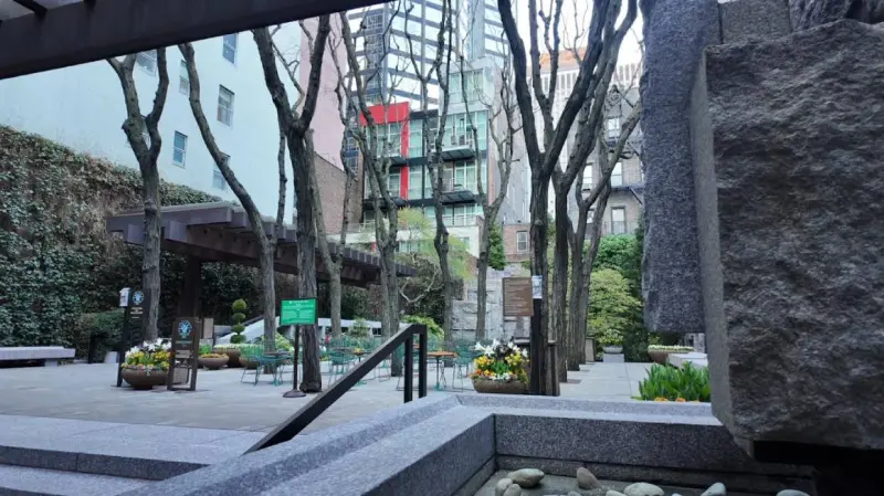 MANHATTAN, Nueva York, EU, 7 de abril de 2026.- El 14 de octubre de 1971, hace 55 años, los neoyorquinos vieron por primera vez el Greenacre Park, un pequeño parque urbano decorado con mesas, pero cuyo gran atractivo es una cascada que brota desde una de sus paredes. En este espacio, los visitantes llegan a escuchar el sonido del agua, a tomarse un café o comer algo, pero todos tienen el mismo objetivo: pasar un momento relajado lejos del estrés de Nueva York.