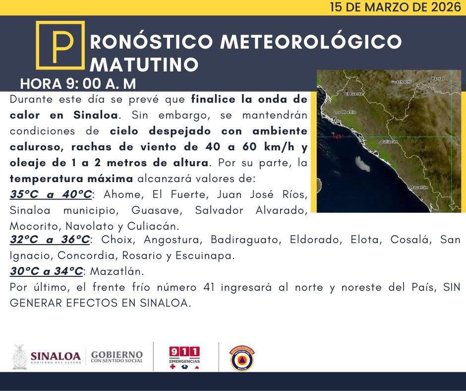 Noroeste 15 Mar, 2026 10:54 Prevén fin de la onda de calor en Sinaloa, pero persistirán altas temperaturas Tras días de altas temperaturas, los reportes meteorológicos estatales indican que este 15 de marzo se prevé el final de la onda de calor en Sinaloa. Ir a leer la nota completa al sitio original Contenido Patrocinado