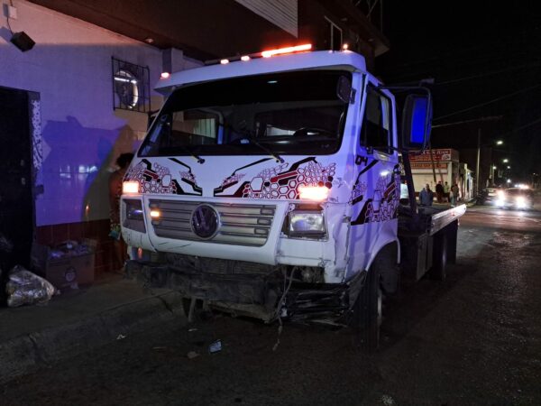 Tras el fuerte impacto, el vehículo Pointer quedó con pérdida total, mientras que el camión grúa también presentó daños materiales de consideración en su carrocería.