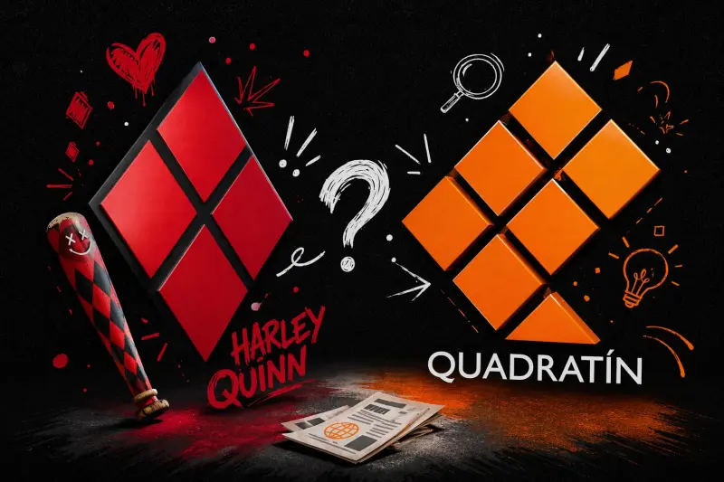 El emblema de Harley Quinn bebe del imaginario del arlequín: rombos, juego, caos, irreverencia. Es un símbolo que no pide permiso; irrumpe. Quadratín, por su parte, construyó su identidad desde la síntesis: formas geométricas, naranja protagónico, modularidad y dinamismo. Información en movimiento, fragmentada, ensamblada en tiempo real.