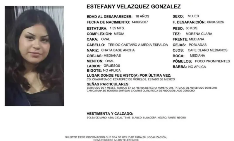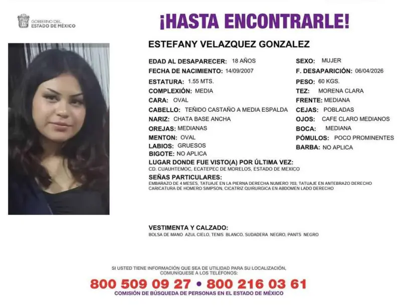 ECATEPEC, Edomex., 10 de abril de 2026.- Autoridades y familiares activaron la búsqueda de Estefany Velázquez González, de 18 años de edad, quien fue reportada como desaparecida desde el pasado 6 de abril en la colonia Ciudad Cuauhtémoc, en este municipio.