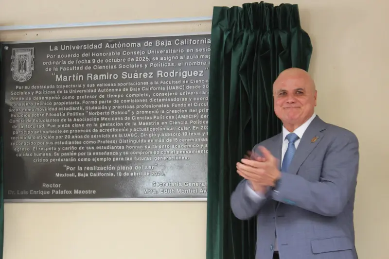 Mexicali, BC.-La Universidad Autónoma de Baja California rindió homenaje póstumo al académico Martín Ramiro Suárez Rodríguez al asignar su nombre al Aula Magna de la Facultad de Ciencias Sociales y Políticas, en reconocimiento a su trayectoria de más de dos décadas en la formación de estudiantes.