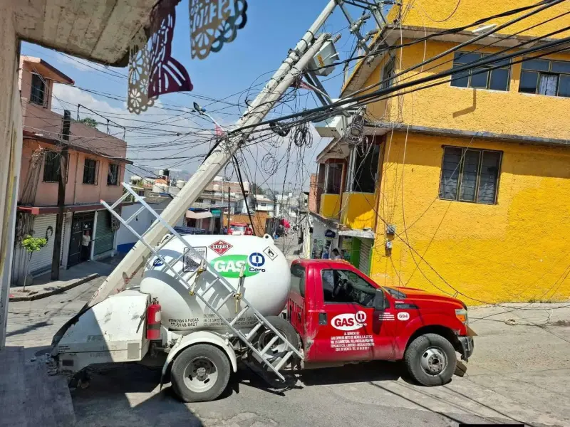 TULTITLÁN, Edomex., 10 de abril de 2026.- Un accidente de pipa en Tultitlán generó movilización de cuerpos de emergencia en la colonia Chilpan, luego de que una unidad de gas se desplazara sin control en reversa y chocara contra infraestructura eléctrica.