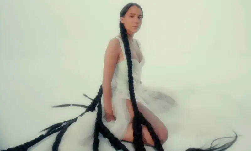 La imagen luego cambia entre este escenario etéreo y un plano contrastante de Majo de pie frente a una llamativa pared azul, con sus trenzas suspendidas sobre ella, reforzando una sensación de dualidad emocional y transición. A medida que se desarrolla la narrativa, se le ve sentada frente a un espejo, cortando metódicamente sus trenzas hasta quedar con un corte pixie.