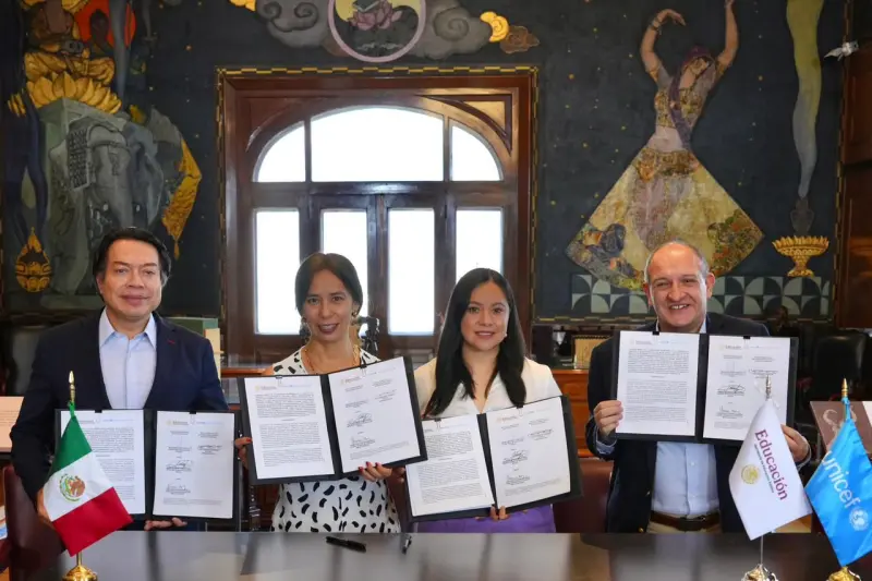 OAXACA, Oax. 14 de abril de 2026.- El secretario de Educación Pública (SEP), Mario Delgado Carrillo, y el representante del Fondo de las Naciones Unidas para la Infancia (UNICEF) en México, Fernando Carrera Castro, firmaron un convenio de colaboración mediante el cual el organismo internacional formaliza su apoyo e impulso a las políticas educativas y de salud en Educación Básica y Media Superior, implementadas por la Presidenta Claudia Sheinbaum Pardo.