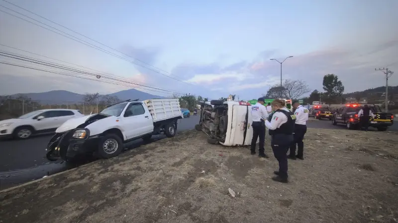 MORELIA, Mich., 15 de abril de 2026.- Un choque con volcadura se registró en la salida a Quiroga, a la altura del fraccionamiento La Hacienda, donde se vieron involucradas dos camionetas.