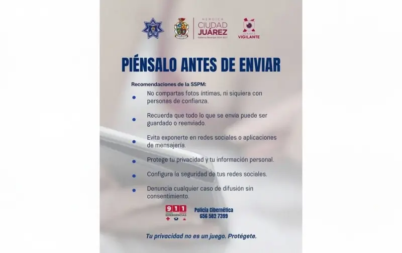 Ciudad Juárez.- La Secretaría de Seguridad Pública Municipal (SSPM) recomienda a la ciudadanía evitar compartir contenido íntimo como fotografías a través de redes sociales o aplicaciones de mensajería.