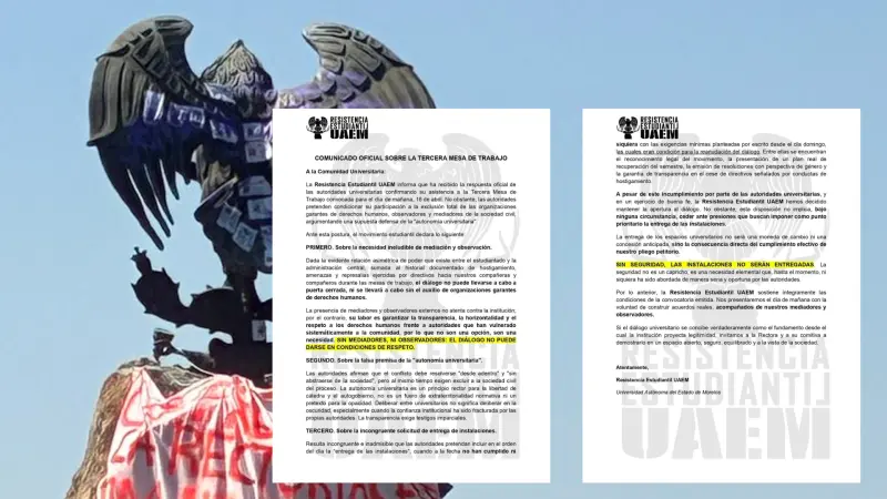 CUERNAVACA, Mor., 16 de abril de 2026.– El conflicto en la Universidad Autónoma del Estado de Morelos (UAEM) sube de tono. El movimiento Resistencia Estudiantil confirmó su asistencia a la tercera mesa de trabajo programada para este jueves 16 de abril, pero lanzó una advertencia tajante: no aceptarán un diálogo “a puerta cerrada” ni permitirán que la autonomía universitaria se utilice como pretexto para la opacidad.