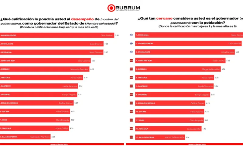 El estudio, que evaluó específicamente a las 13 entidades de la República que actualmente son gobernadas por mujeres, destaca que Morelos ha escalado posiciones en la percepción ciudadana, situando a la titular del Ejecutivo local en un nivel de aprobación que la consolida dentro del bloque puntero de gobernadoras a nivel nacional.