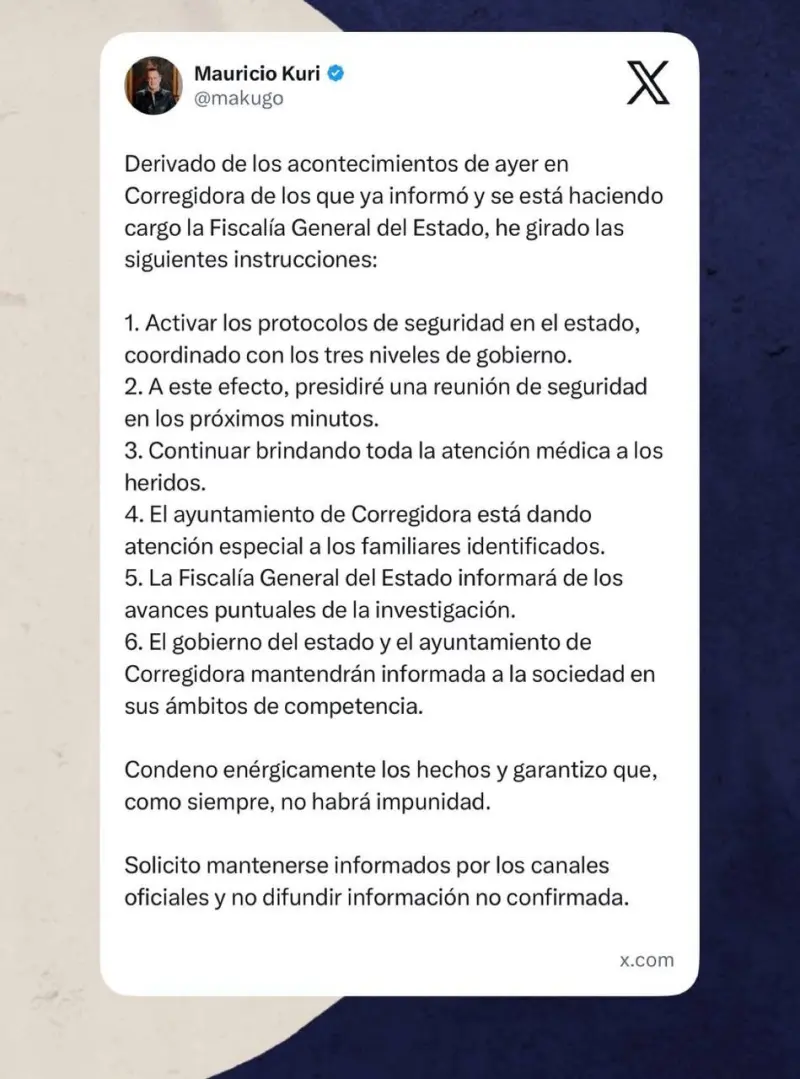 A través de un mensaje, el mandatario estatal informó que se instruyó una coordinación inmediata entre los tres niveles de gobierno para atender la situación, además de que encabezaría una reunión de seguridad para dar seguimiento a los hechos.