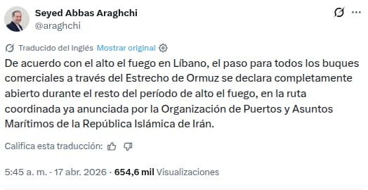 El ministro de Asuntos Exteriores de Irán, Abás Araqchi, confirmó que todos los buques comerciales pueden transitar libremente durante el alto el fuego vigente, siempre bajo rutas coordinadas por autoridades marítimas iraníes.