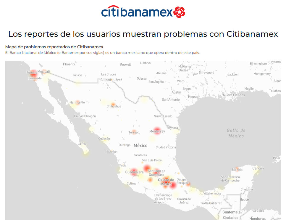 De acuerdo con el portal DownDetector, los reportes comenzaron desde el final del viernes 17 y el comienzo del sábado 18 de abril , con un incremento sostenido de fallas. El primer pico ocurrió a las 12:32 am, con 434 incidencias. Posteriormente, el sistema parece que se estabilizó moderadamente, y volvieron a reportarse más fallas desde las 6:00 am. Alrededor de las 9:32 de la mañana alcanzaron su punto máximo, con 825 reportes registrados. Usuarios en redes sociales han compartido que, al intentar ingresar a la aplicación, les aparece el mensaje: "Estamos trabajando para brindarte un mejor servicio. Por favor, intenta más tarde". En algunos casos, se mencionan notificaciones de cargos no reconocidos que no pueden verificar, por la imposibilidad de entrar a su cuenta. El problema no solo se queda en la aplicación, también afecta en los servicios de banca móvil y en línea para ingresar desde un ordenador. Los principales problemas reportados, a las 10:15 de la mañana fueron: El mapa de calor de la plataforma especializada indicó que las zonas con más reportes fueron: